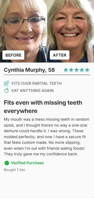 Before:My old dentures always felt uncomfortable and sore after a few hours.After:These dentures adapt perfectly to my gums and bite. I wear them all day without any pain.