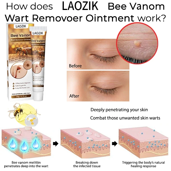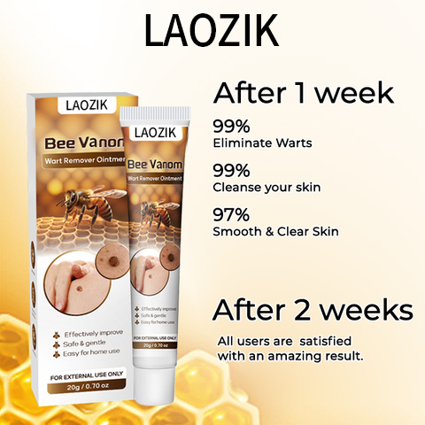LAOZIK™ Bee Vanom Wart Remover Ointment is a gentle yet powerful solution for eliminating warts and skin tags. Unlike harsh treatments that cause burning or scarring, this formula harnesses the natural power of bee venom, panthenol, and sophora extract to dissolve unwanted growths without pain or irritation. It not only removes warts but also hydrates and repairs the skin, leaving it smooth and flawless. Safe for all skin types, it’s the perfect alternative to costly dermatologist visits or risky home remedies.